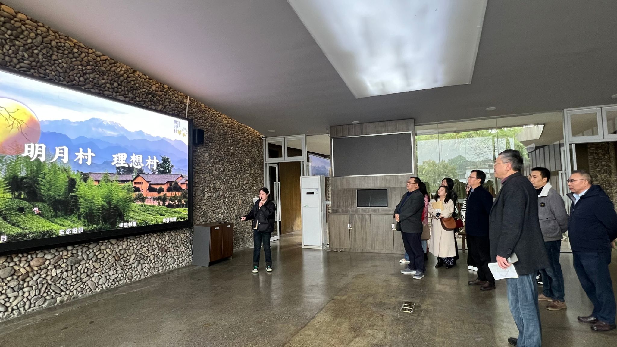 工作人员讲解明月村的发展历程